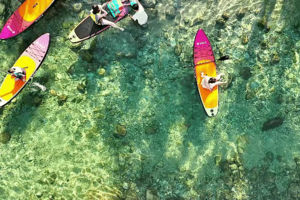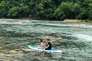 ① 桨板 SUP 在平静水域开启「水上轻功」,专业教练 10 分钟教会你站立划行。划到湖心时,旁边的喀斯特峰林倒映水中,前面的瀑布水仿佛置身《阿凡达》取景地,记得打开手机连拍模式!
