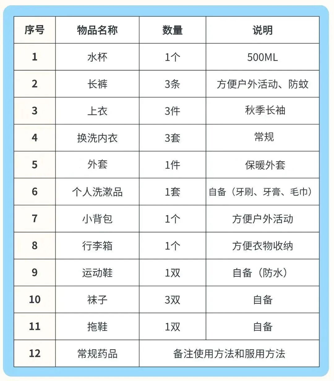 5. 本次活动的物品准备如下,请参与的营员提前做好准备: