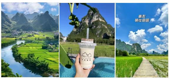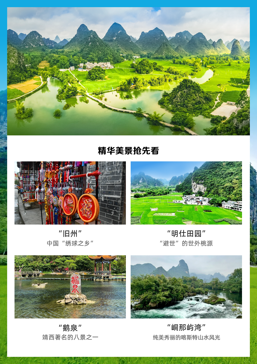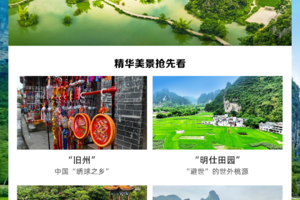 后前往【明仕田园骑行】沿途可欣赏两岸的喀斯特峰林地貌景观、田园风光以及凤尾萧萧,龙吟嘀嘀的碧江竹影等。游览景区内的各个景点,如龙头山观景台可俯瞰全景,鱼鳞坝有拦水的河堤、旋转的水车,风景似宫崎骏动画场景 。
