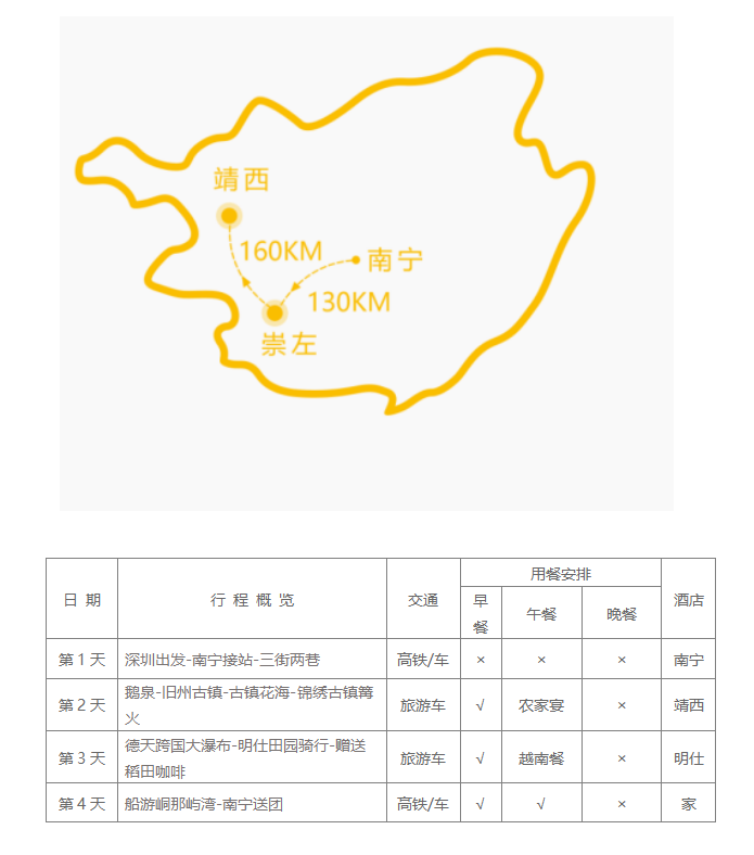 下午根据返程时间收拾好行李,结束愉快的广西之旅!(返回班次参考D3829/南宁-广州南15:37-19:19中转深圳北班次,具体班次以出票为准!)