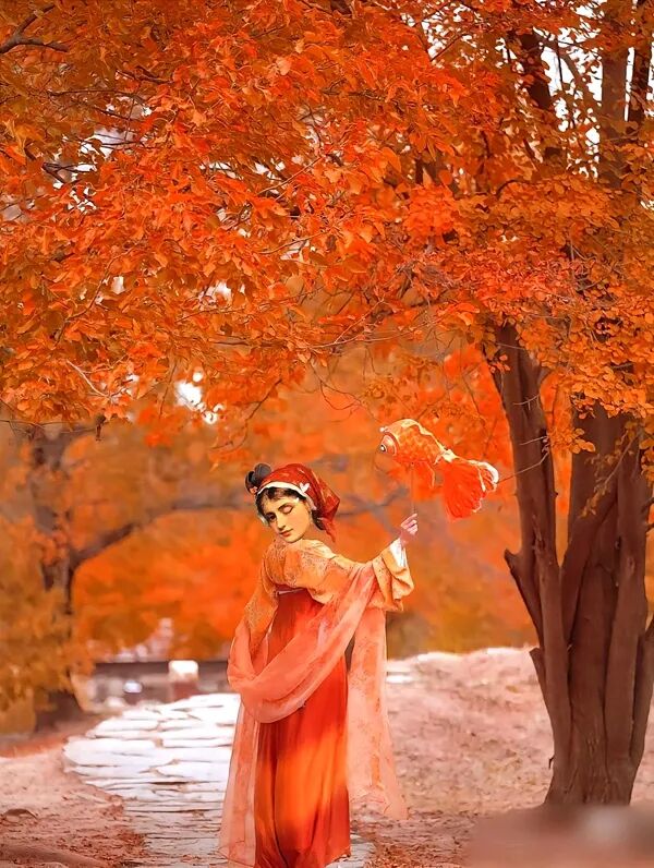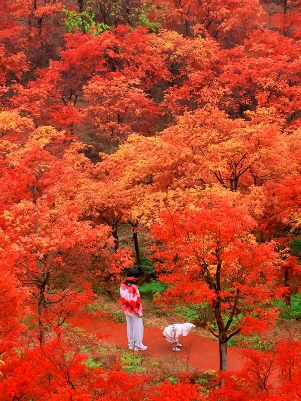 漫山的枫叶里,深红、粉红、橙红、橘红,层次分明