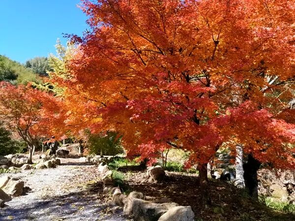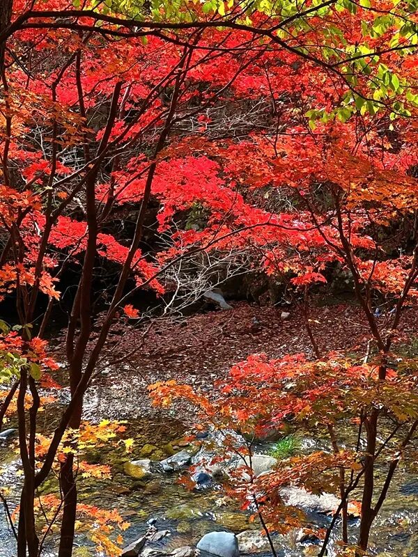 12:30 到达【十里枫叶林】,走路20分钟抵达枫叶林。抬眼望去,层层叠叠的枫叶红得浓烈,红得似火,染红了山谷,染红了山涧,就像一条鲜红的地毯铺在蜿蜒曲折的山谷中,美轮美奂,美不胜收。