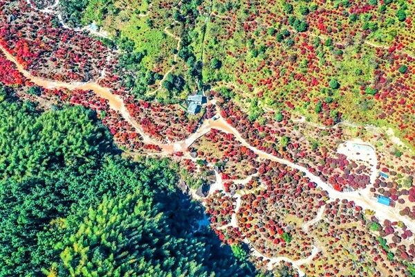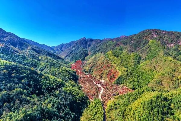 从高空俯瞰,火红的枫叶与竹林山色构成了一幅秋日“枫”景画卷。