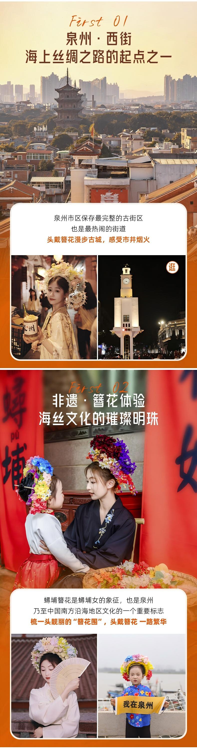 在西街体验【簪花围】“戴簪花圈,插象牙筷”头饰的蟳浦女,她们与惠安女、湄州女一起并称福建三大渔女,蟳埔簪花是蟳埔女的象征,也是泉州乃至中国南方沿海地区文化的一个重要标志。