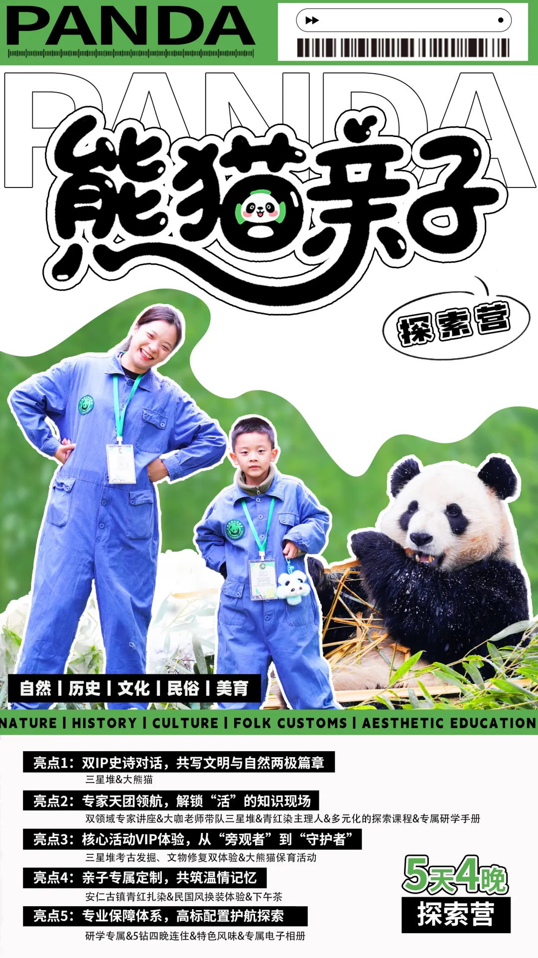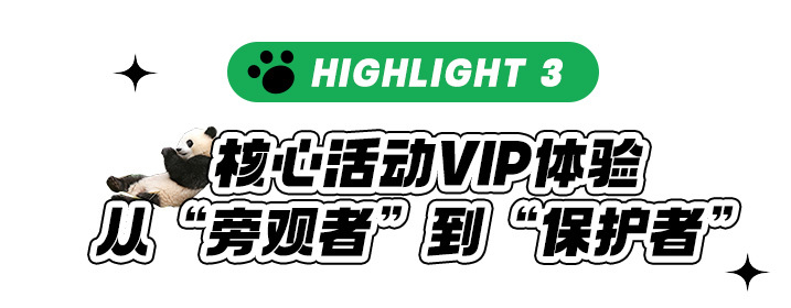 【国宝守护——化身小小“保育员”】从大熊猫的行为习性观察到深入大熊猫国家保护区,并做一名合格的国宝“铲屎官”,走进基地非游客区域进行义工体验。帮大熊猫搬运竹子、在饲养员带领下观看饲养员喂食熊猫、行为观察分析、“制作窝窝头”等等,争取当个被大熊猫认可的一日“保育员”