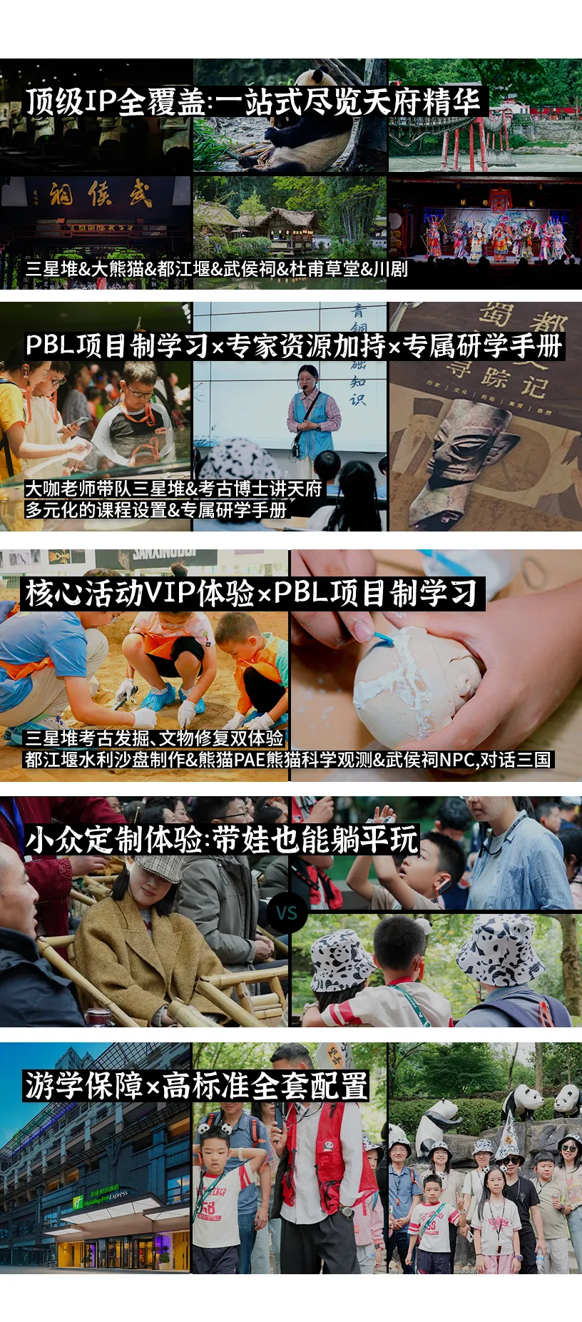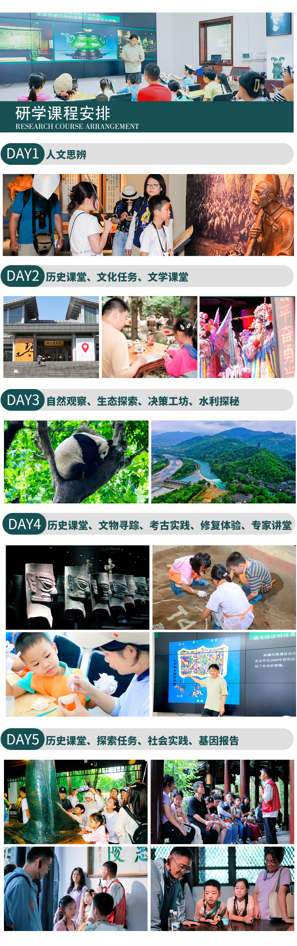 整趟旅程是—场沉浸式文化考古,孩子们将像考古学家—样,每日挖掘—个文化基因片段,完成从 “碎片”到“图谱”的整合,构建对成都立体而完整的理解,获得可迁移的思维方式和文化洞察力