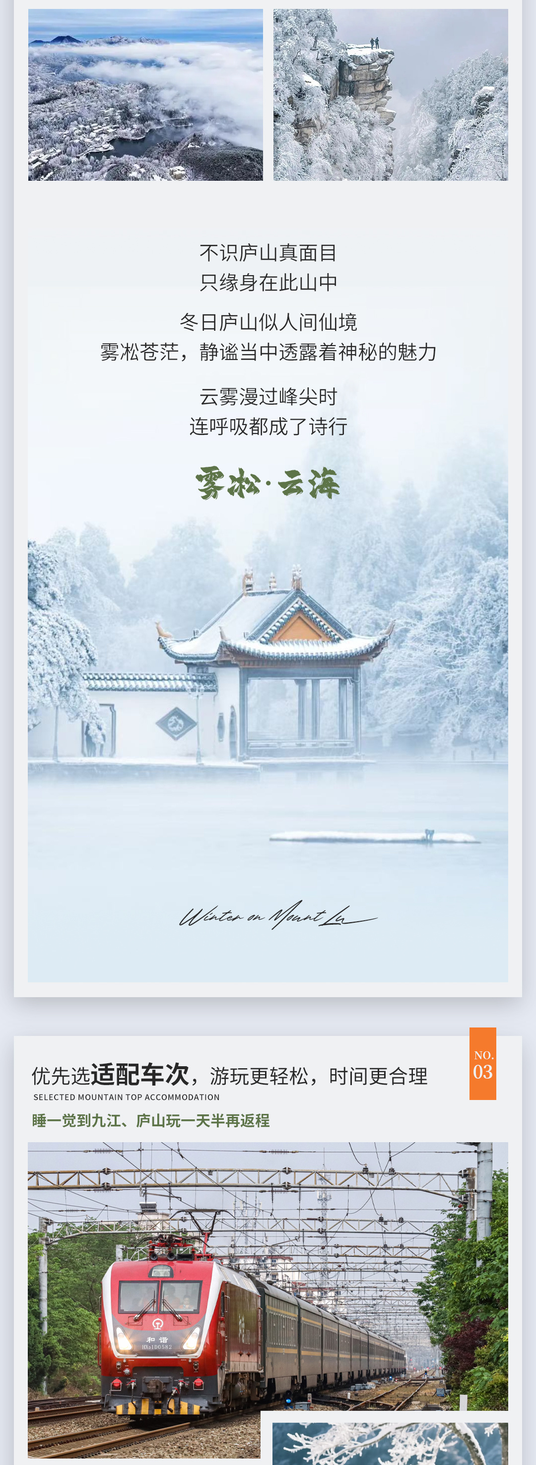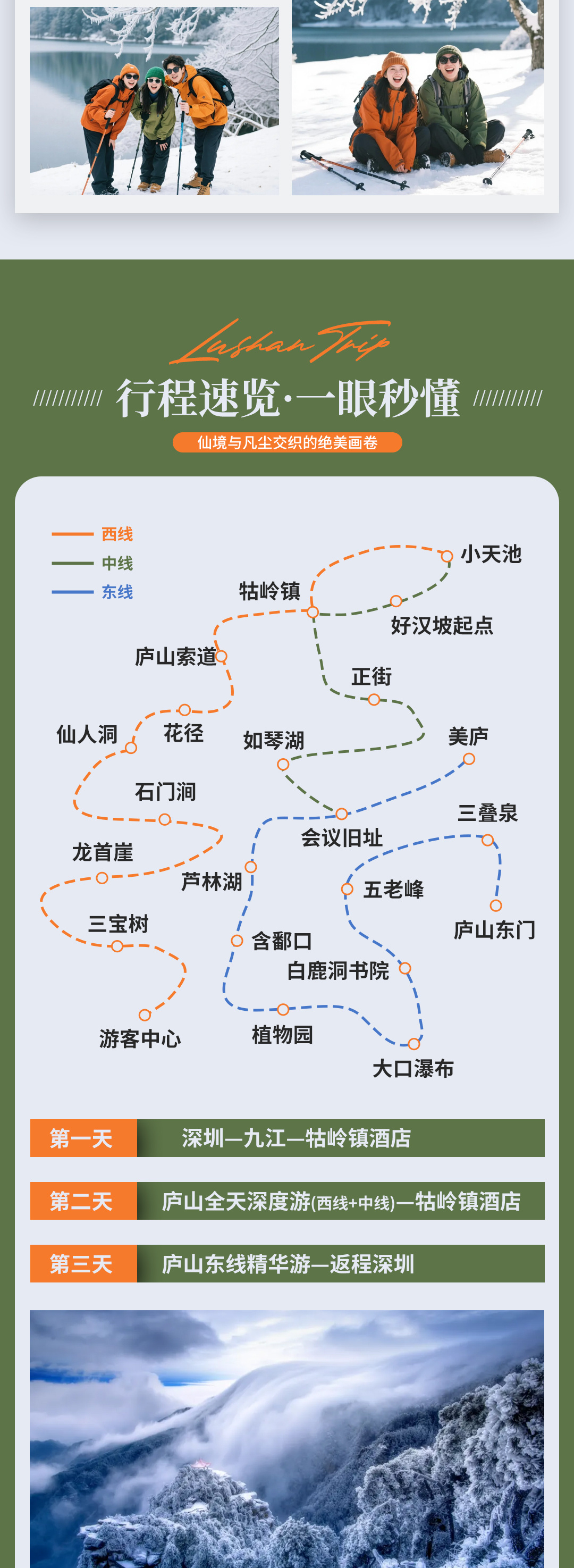 11:00前回到牯岭镇,取行李后乘索道下山(已包含),集合人齐前往九江站,结束本次的冰雪云海之旅。