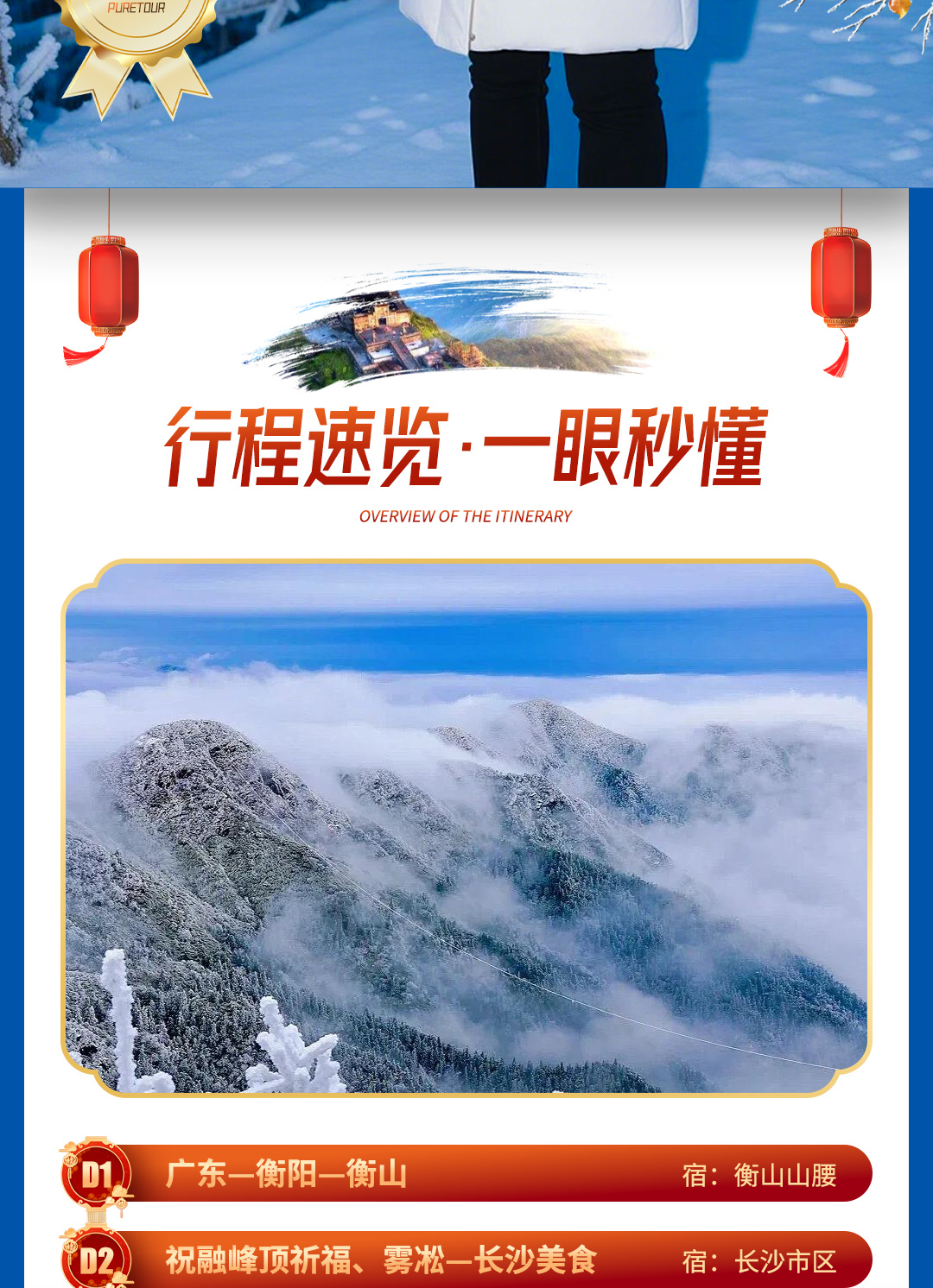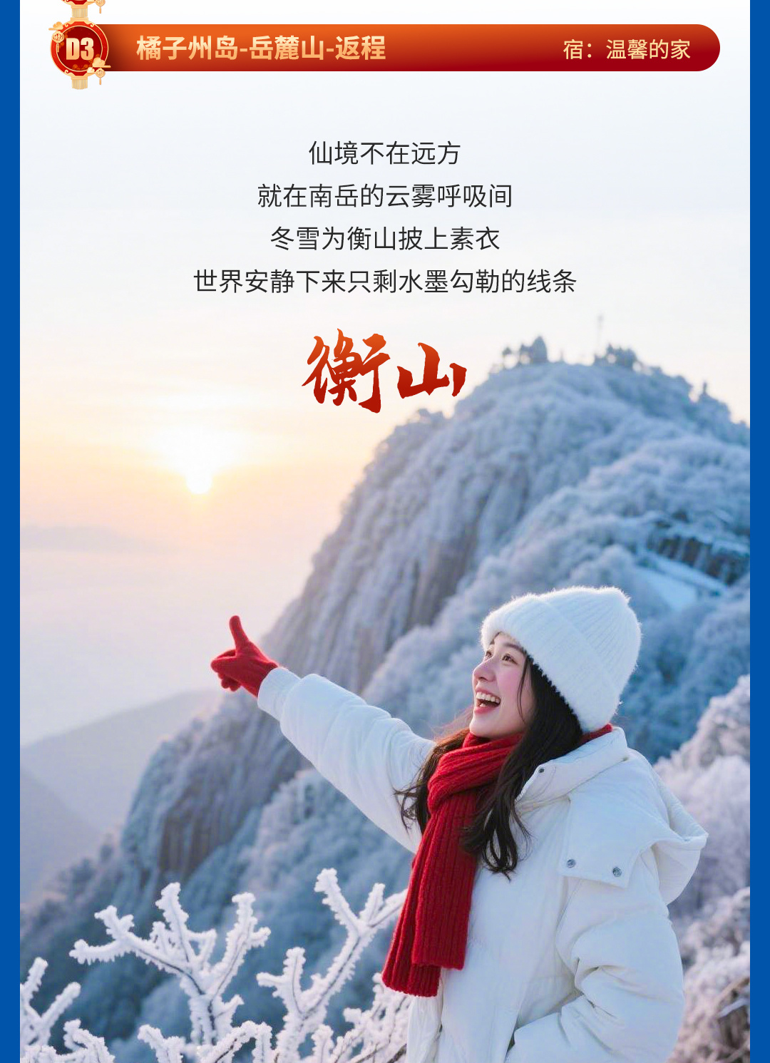 不看日出的7:00起床,爬上衡山最高峰-祝融峰(约2-3小时)也可坐景区环保车(费用自理)到达南天门步行2公里至祝融峰,远眺我国江南规模最大的高山金刚利宝塔,游览“南岳新八景”中的人间仙境——麻姑仙境、民国时期湖南省省长何键为他女儿所建,蒋介石夫人宋美龄也多次来此游泳的——灵芝泉等景点。南岳衡山历来就有“中国南方最美赏雪胜地”的美誉,雾凇景观千姿百态,丝丝状似银针,颗颗状似玉珠,朵朵状若琼花,美轮美奂让人心旷神。(雾凇雪景和日出都属于自然天气景象,山顶未必有雪或无法看到日出,行程介绍只作为参考)