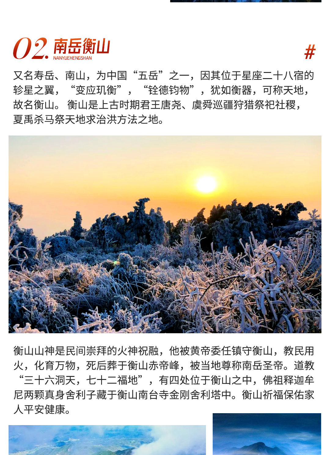抵达最高峰——祝融峰海拔高度1290米,那有祝融殿、望月坛、南天门牌坊、“钢丝王子”阿迪力世界纪录创造地,会仙桥观音岩,看云海翻腾,雾凇仙境,南岳衡山风光美不胜收。