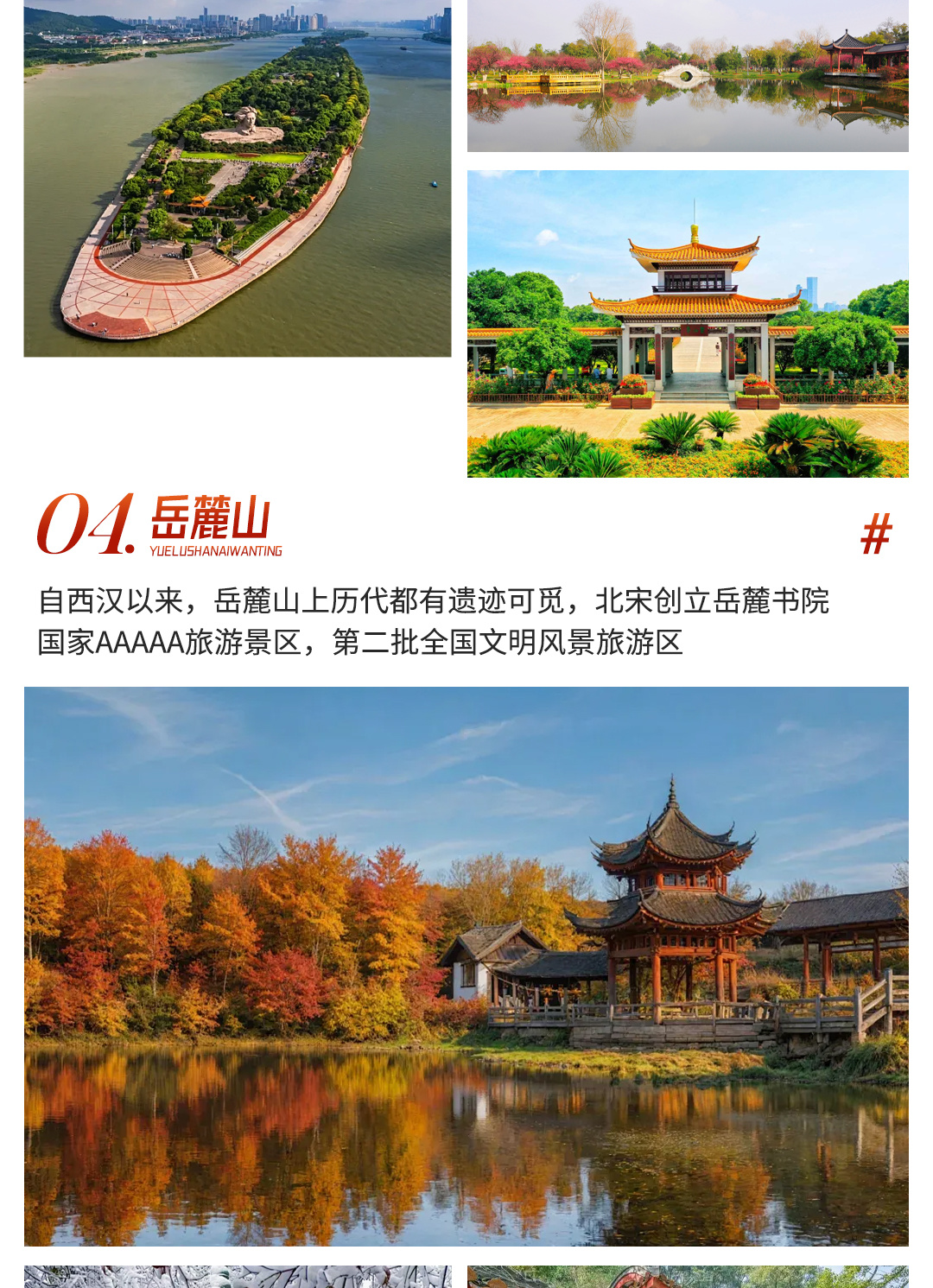 10:30游览衡山七十二峰之尾峰【岳麓山】(门票免费,游览约 1.5小时,景区内环保车往返30元/人自理,也可步行往返)。有着江南四大名亭之称的【爱晚亭】,这里得名于杜牧的诗句“停车坐爱枫林晚,霜叶红于二月花”。