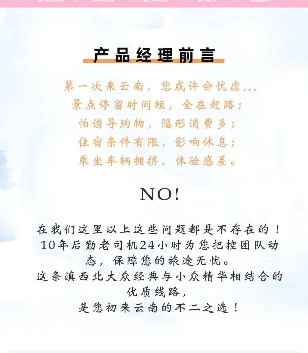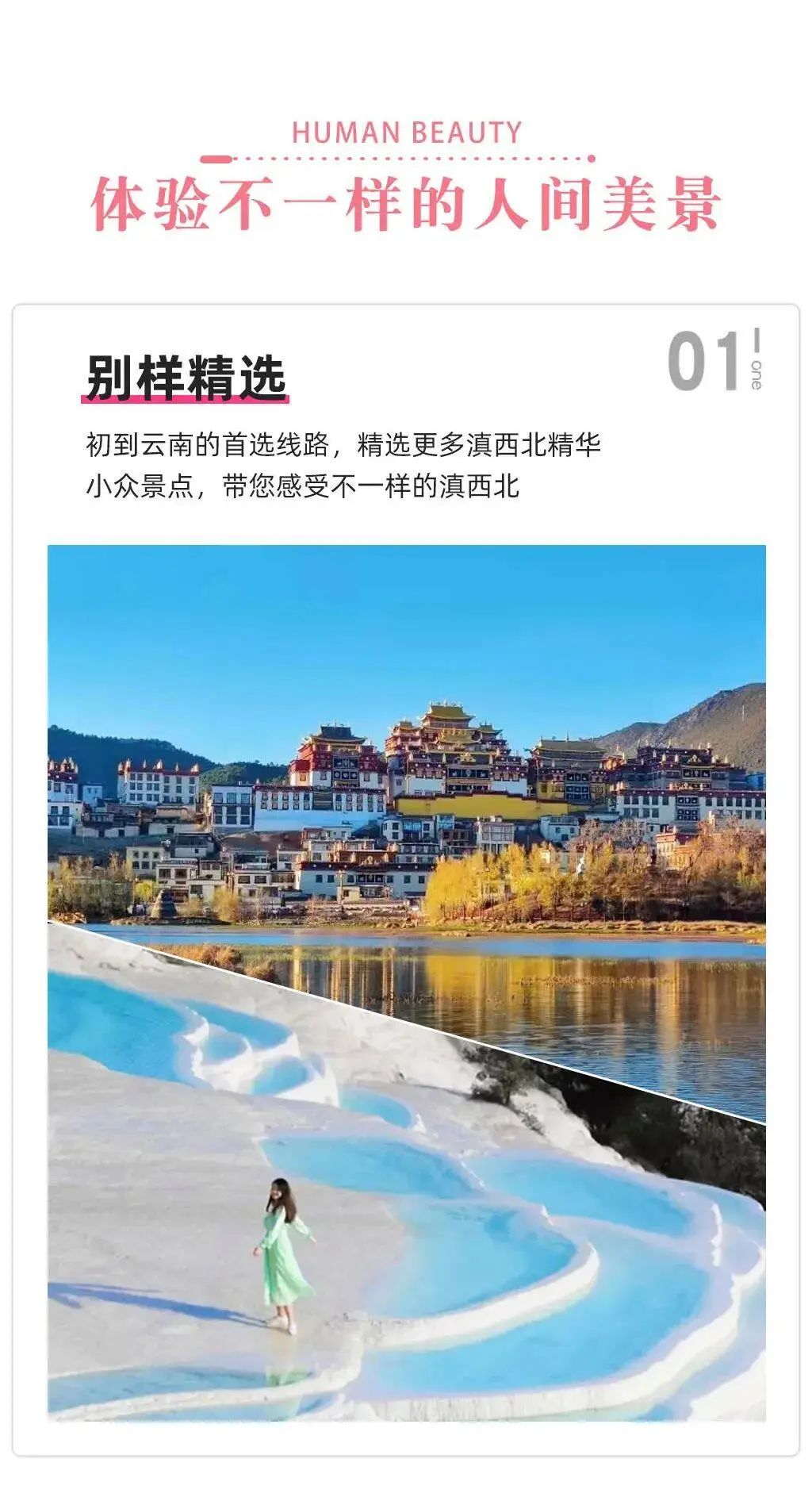 1.别样精选: 初到云南的首选线路,精选更多滇西北精华小众景点,带您感受不一样的滇西北;