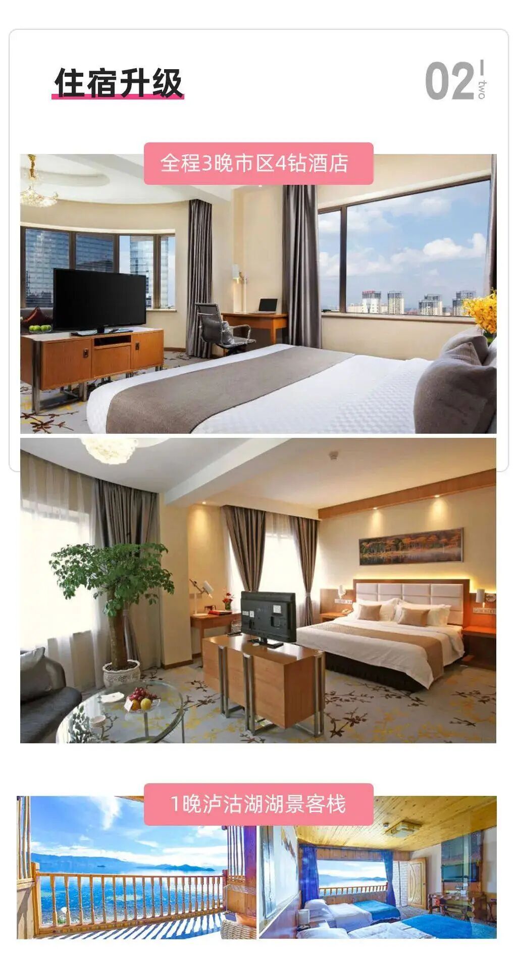 3.住宿升级:全程3晚市区四钻酒店+1晚泸沽湖湖景客栈+2晚景区精选客栈(酒店);
