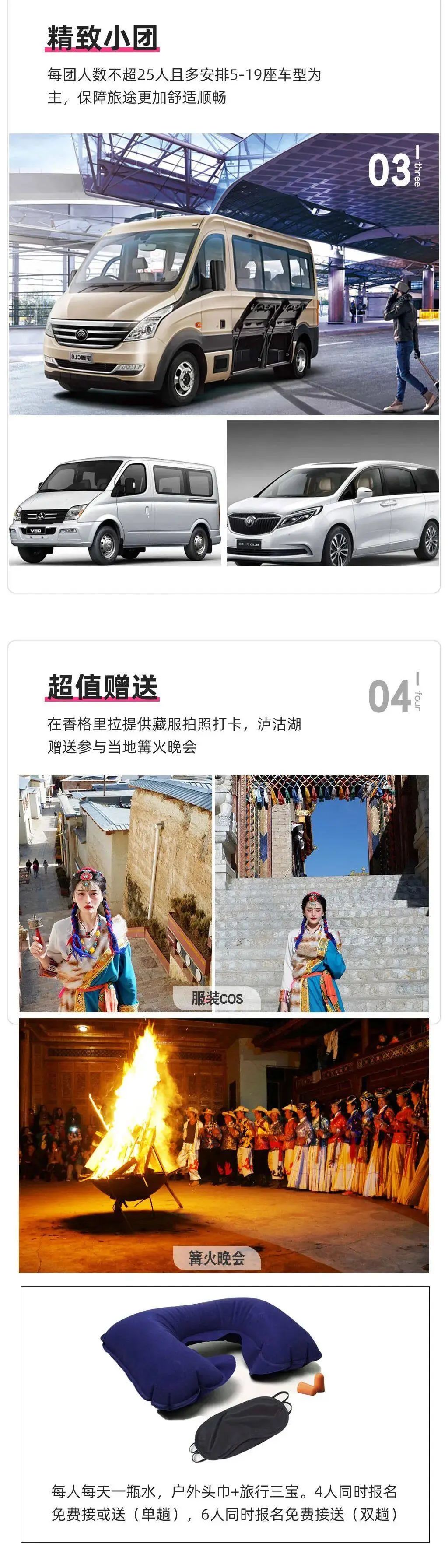 7.超值赠送:在香格里拉提供藏服拍照打卡,泸沽湖赠送参与当地篝火晚会,每人每天一瓶水,户外头巾+旅行三宝。4人同时报名免费接或送(单趟),6人同时报名免费接送(双趟)。