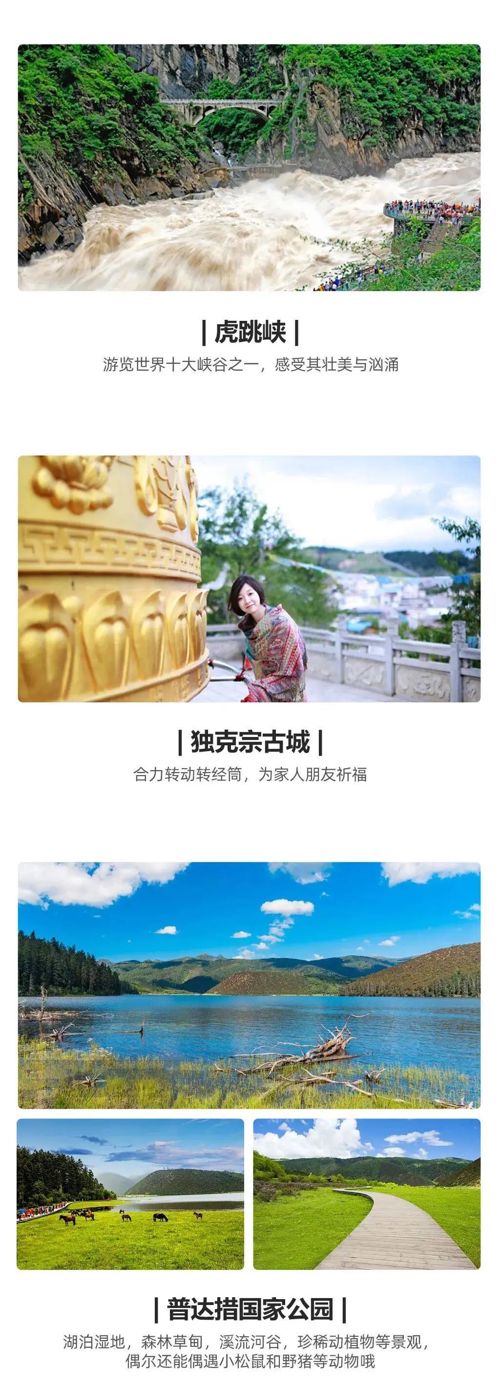 2、 全程门票费:普达措国家公园门票+区间车费、松赞林寺门票+区间车、上虎跳峡门票、泸沽湖门票、泸沽湖猪槽船游船费、白水台门票、洱海旅拍费用(白天空之镜,海上钢琴,洱海之眼,天梯,花园秋千,日落之窗,咖啡屋道具使用 含额外赠送每人6张简修/精修图片);