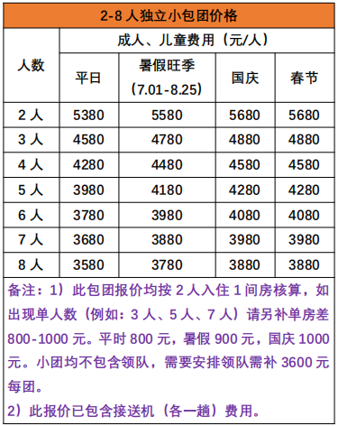若您的出行日期和所示团期不同,或者是几个人想单独定制出游的,都可以联系我们客服,根据您的时间和需求,随订随走。独立小包团2-8人出行价格如下: