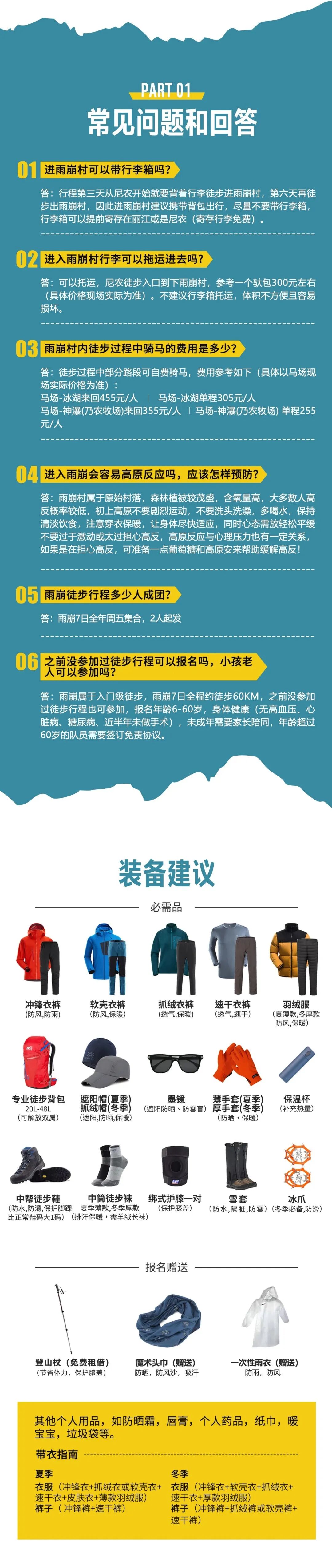 10、赠送说明:本行程免费赠送集合日丽江住宿(部分日期除外,详见费用说明处) 、提供雨衣登山杖证书奖牌各1份,不使用则无费用退还;