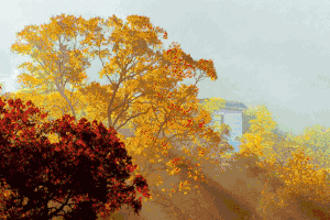 清晨雾气或炊烟中的火红枫树简直就美得不像人间植物了。