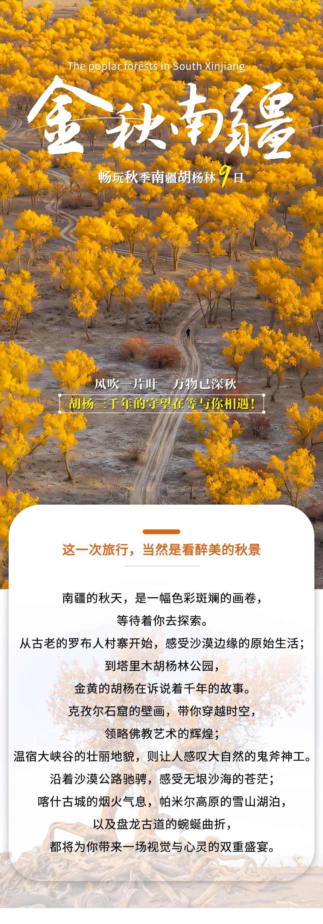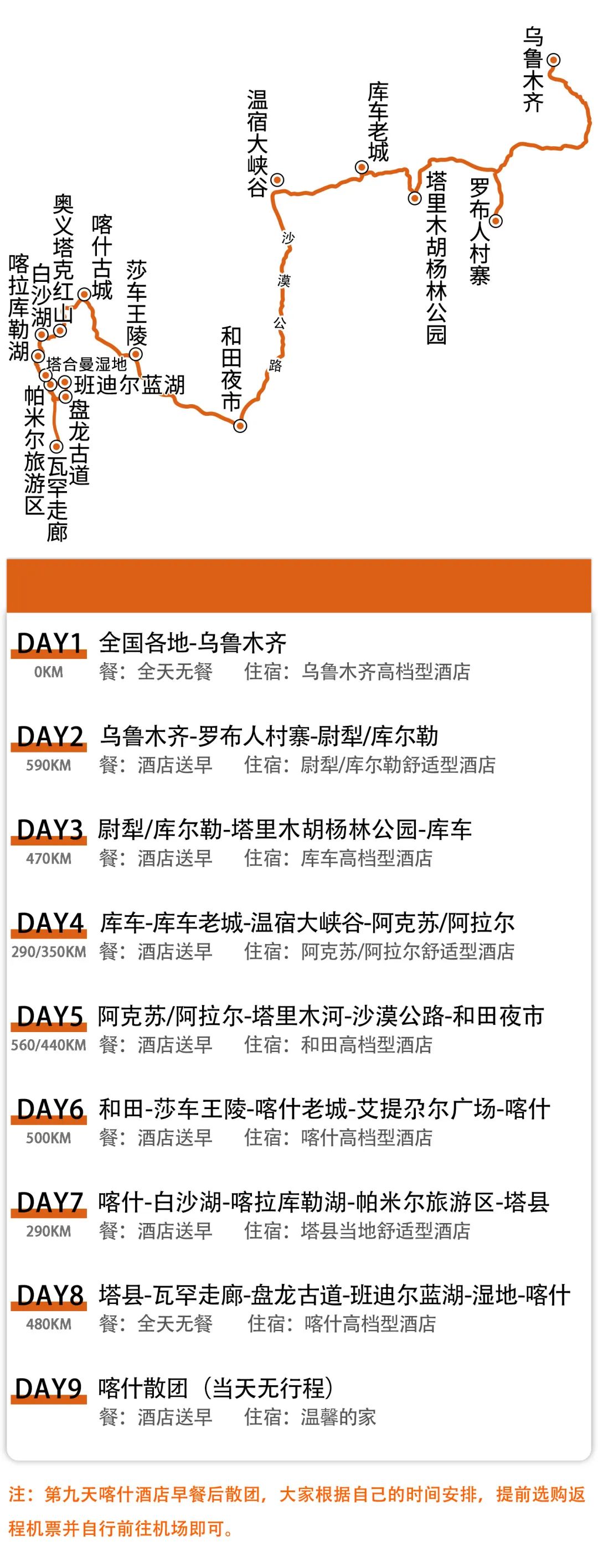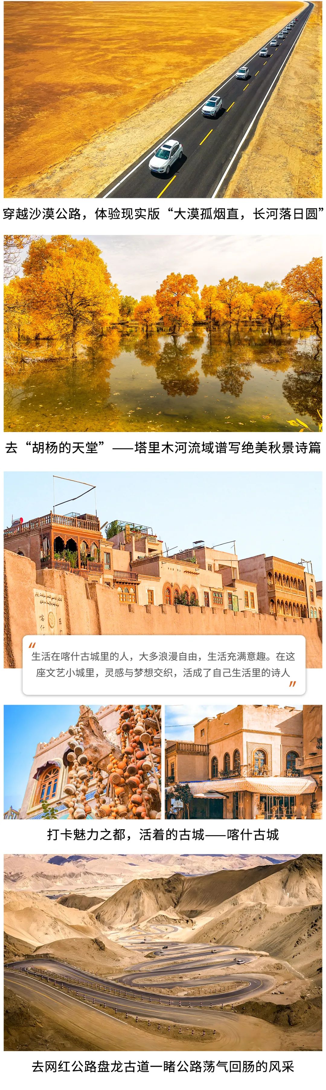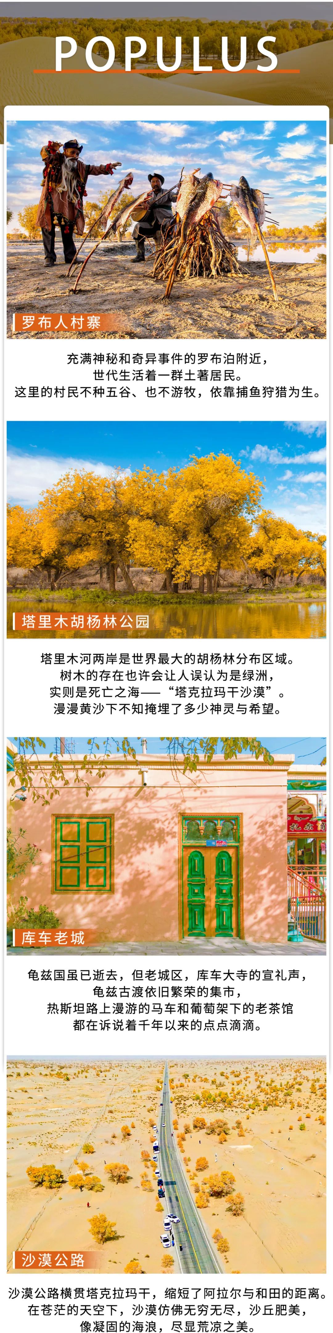 罗布人村寨、塔里木胡杨林、库车老城、温宿大峡谷、沙漠公路、喀什古城、盘龙古道、石头城&金草滩、瓦罕走廊、班迪尔蓝湖、胡杨林特辑9日