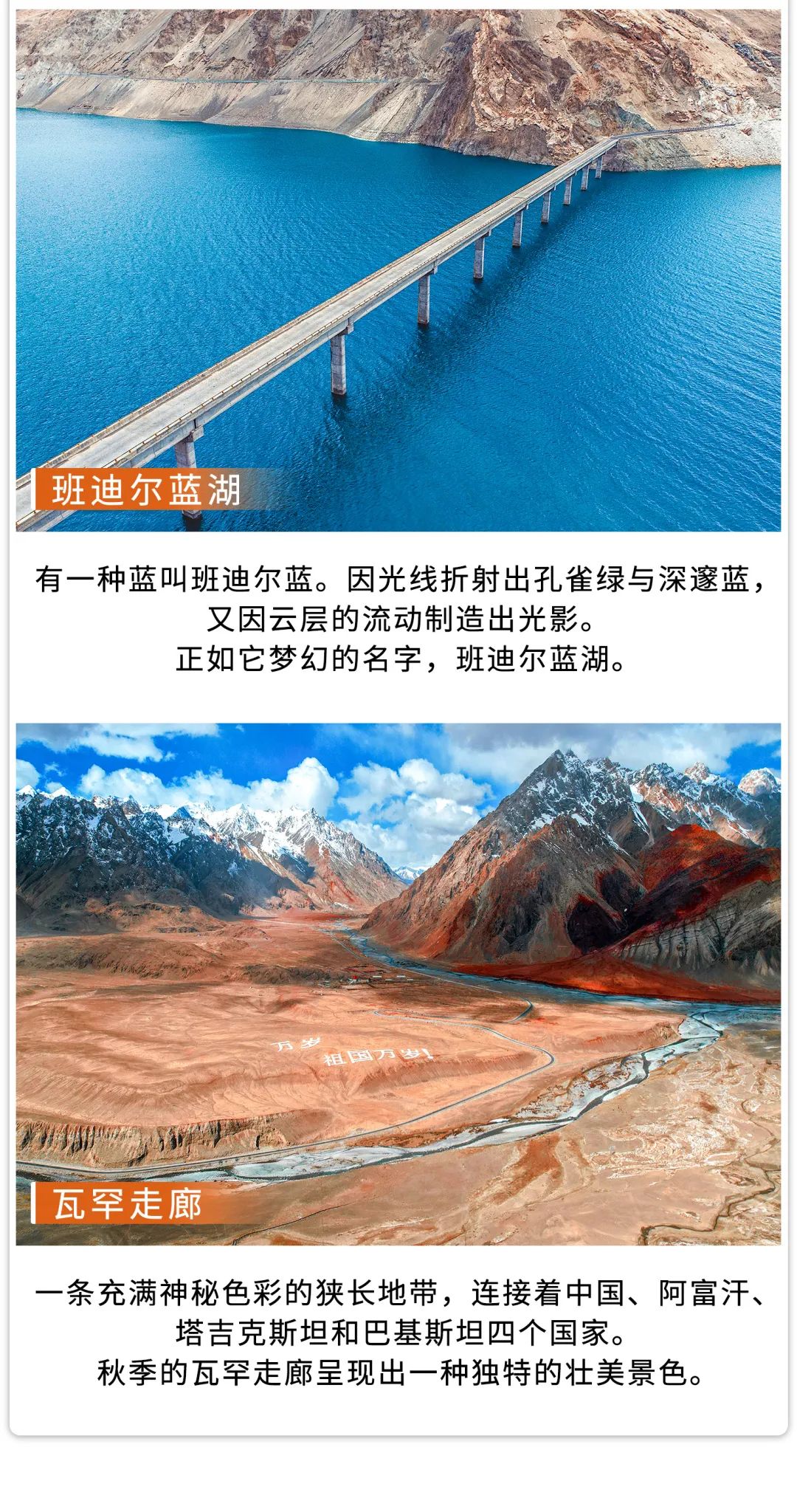 今日出发去瓦罕走廊打卡,瓦罕走廊是古丝绸之路的一部分,也是华夏文明与印度文明交流的重要通道。东晋高僧法显、大唐高僧玄奘和西域佛经汉译创始人安世高(安息高)都曾经过这里,去古印度(天竺)研究佛法。后前往网红打卡圣地——盘龙古道(自理车费每人200元,高原地区,路面结冰,如遇道路封闭或临时交通管制,则无法前往,敬请谅解!) 这条公路拥有弯道600多个,其外型犹如一条黑色巨龙盘绕在昆仑山脉,一路蜿蜒而下,实在壮观。从盘龙古道下来,去看班迪尔蓝湖,班迪尔蓝湖做为帕米尔高原的小众风景,雪山、蓝湖、荒野,仿佛到了世界尽头,非常具有美感。而后前往塔合曼湿地,每当秋季这里溪流纵横,不时有禽鸟居于此地,雪山草原、蓝天白云......尽收眼底,而后前往今日住宿地。