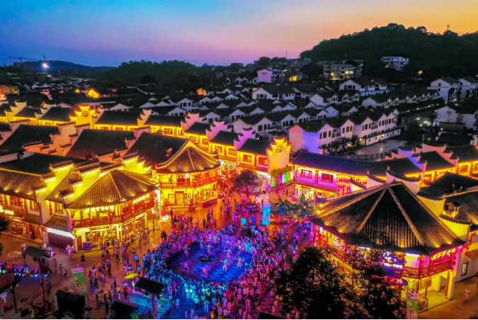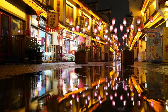 华灯初上,灯笼高挂,布幌摇曳,屋黛瓦青的街巷热闹非凡。