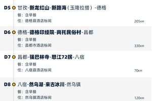 4、景交:新龙红山景区观光车单程30元/人、往返50元/人(必须),色达预约48-168元/人,报名后请根据自己的游玩日期自行预约;玉隆拉措观光车50元/人(必须);来古冰川观光车60元/人(必须);索松村观光车90元/人(必须);