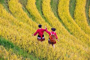 一层层、一排排的水稻梯田一片金黄铺陈在眼前