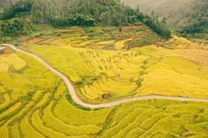 层层叠叠的梯田线条勾勒出一幅美丽的丰收画卷。
