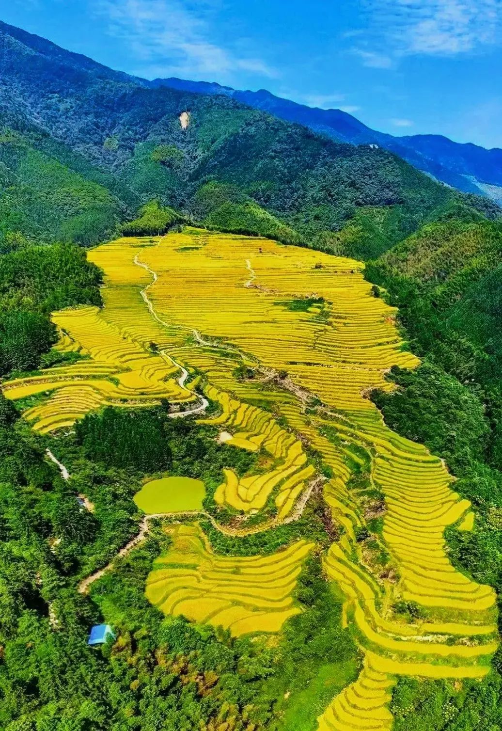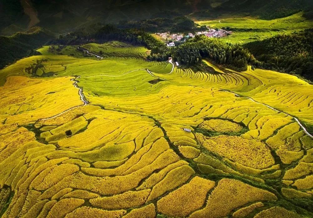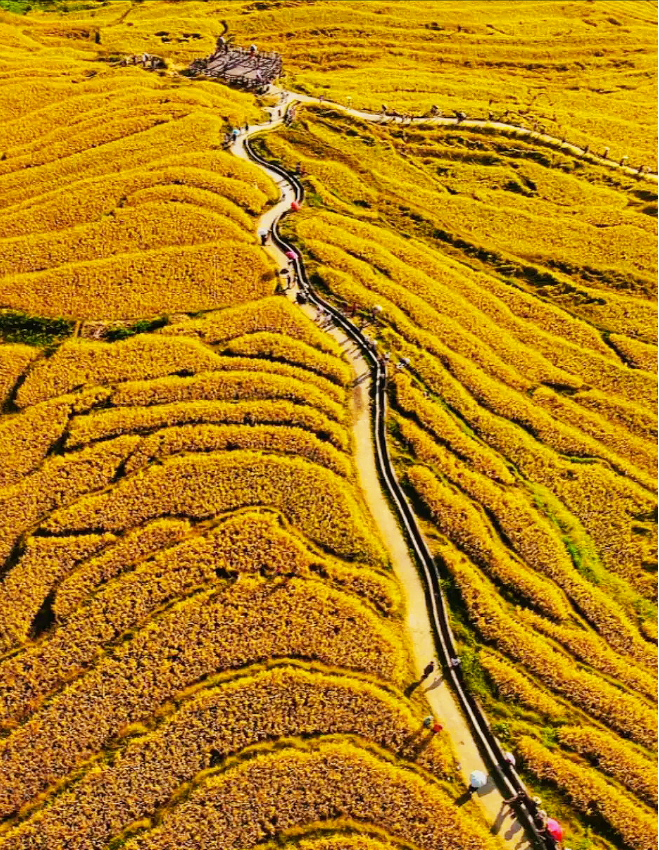 层层叠叠的梯田线条勾勒出一幅美丽的丰收画卷。