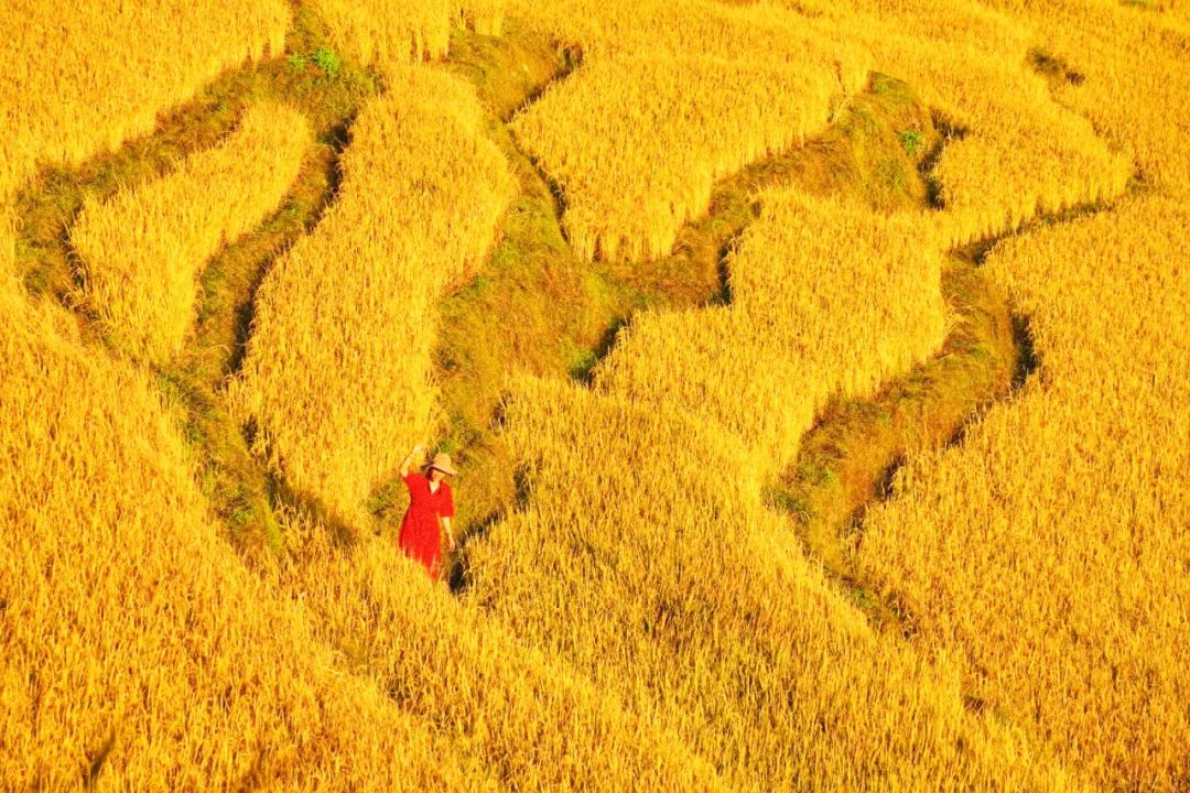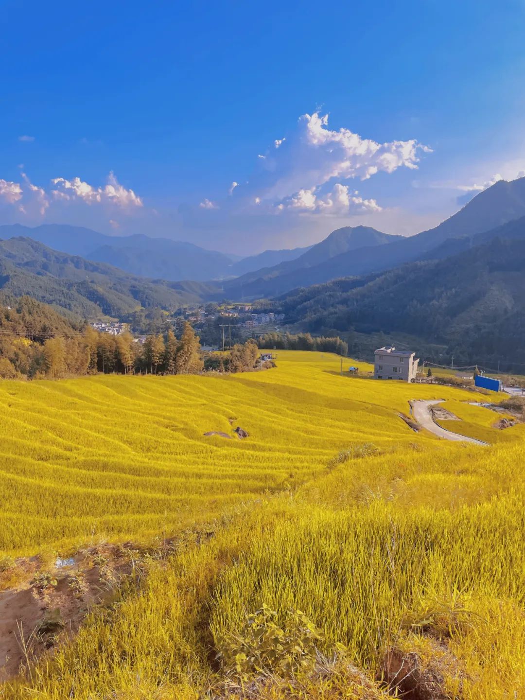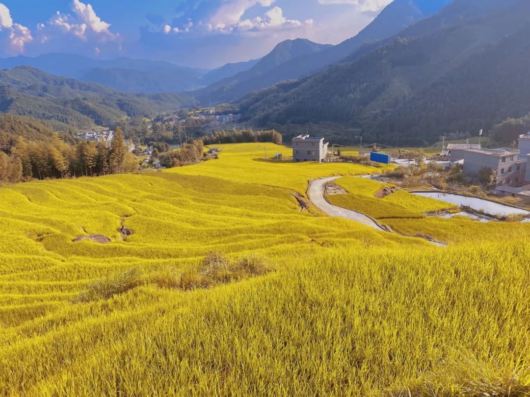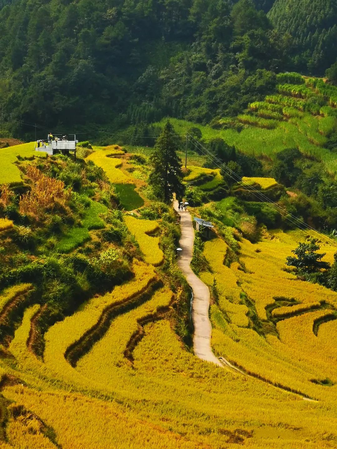 一层层、一排排的水稻梯田一片金黄铺陈在眼前