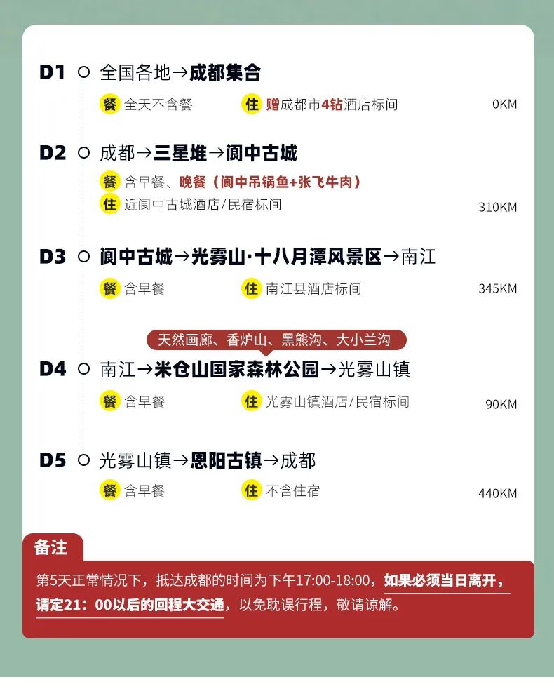 (1)用餐:全程4个早餐+1个特色餐(阆中吊锅鱼+张飞牛肉),如队员另外点餐,需自己支付费用;