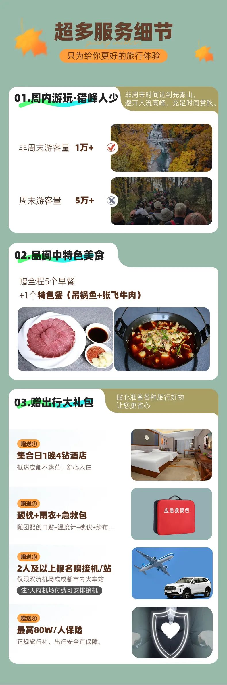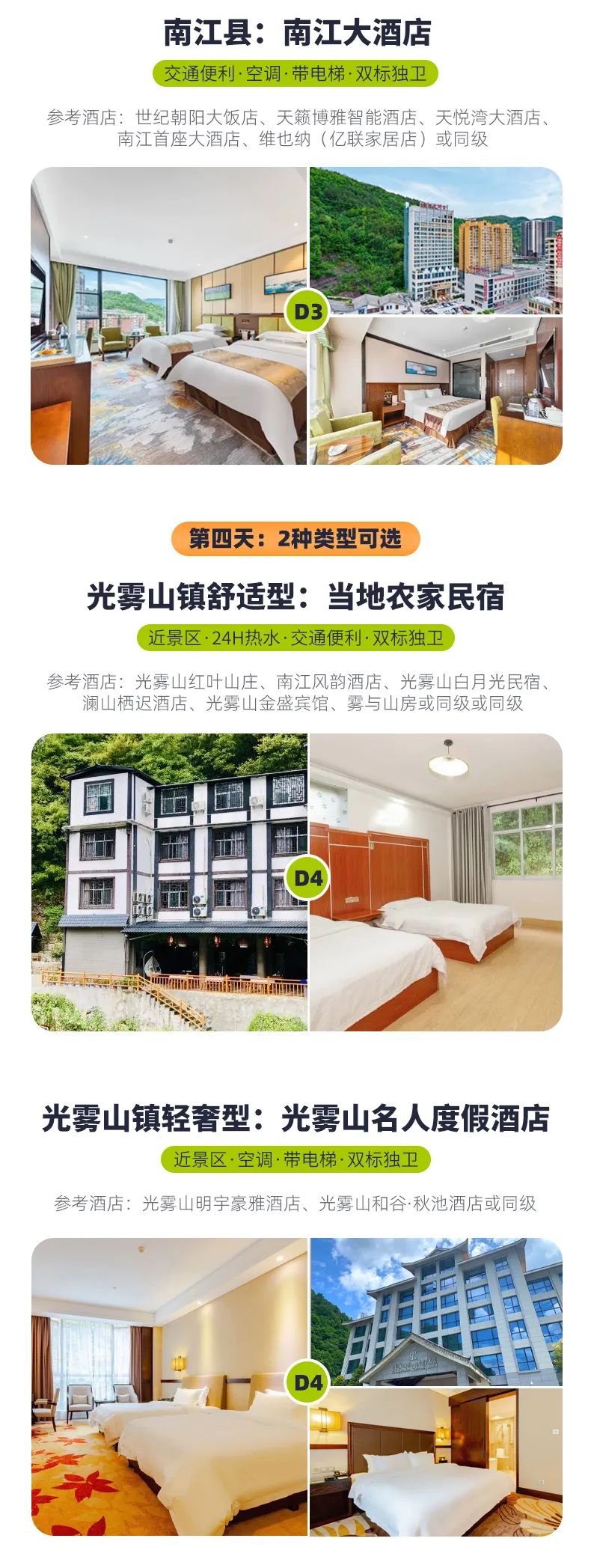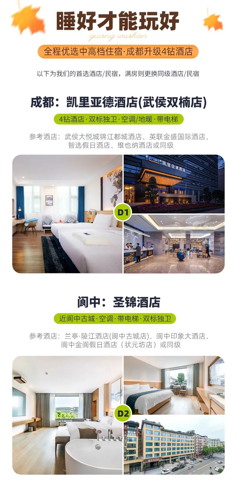 纯玩散拼价:成都1晚4钻酒店+3晚舒适型酒店,2780元/人,单房差700元/人;光雾山镇升级1晚轻奢型住宿+200元/人。