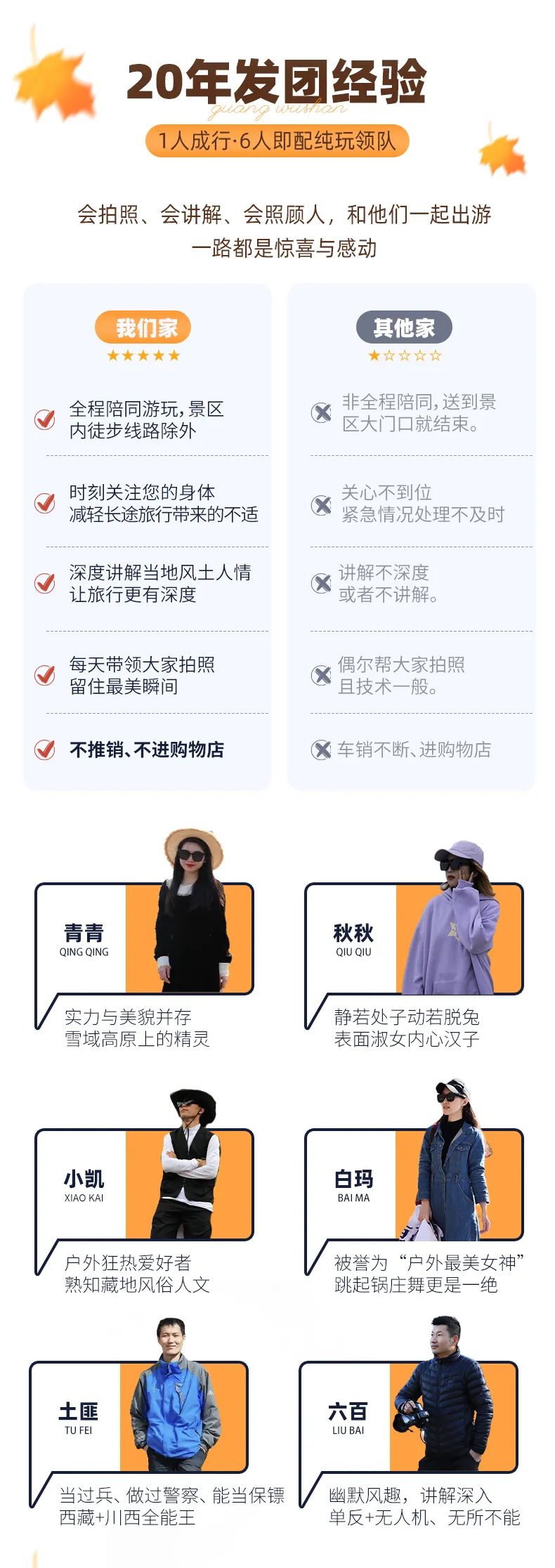 4、领队:优秀领队服务(1-5人司机兼向导,6人及以上配专职领队,已含领队食宿门票);