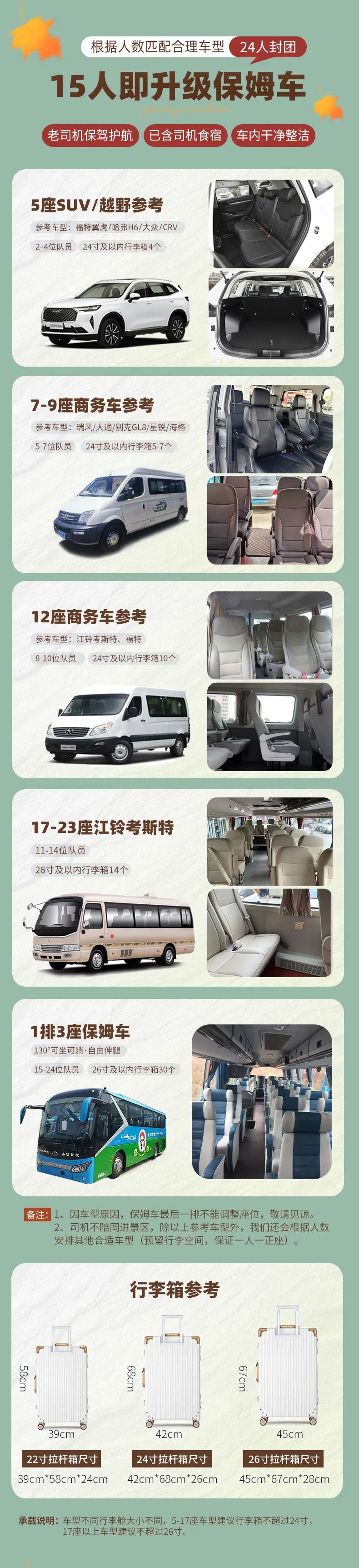 1、交通:根据人数确定车辆,15人即升级保姆车(已含驾驶员食宿);