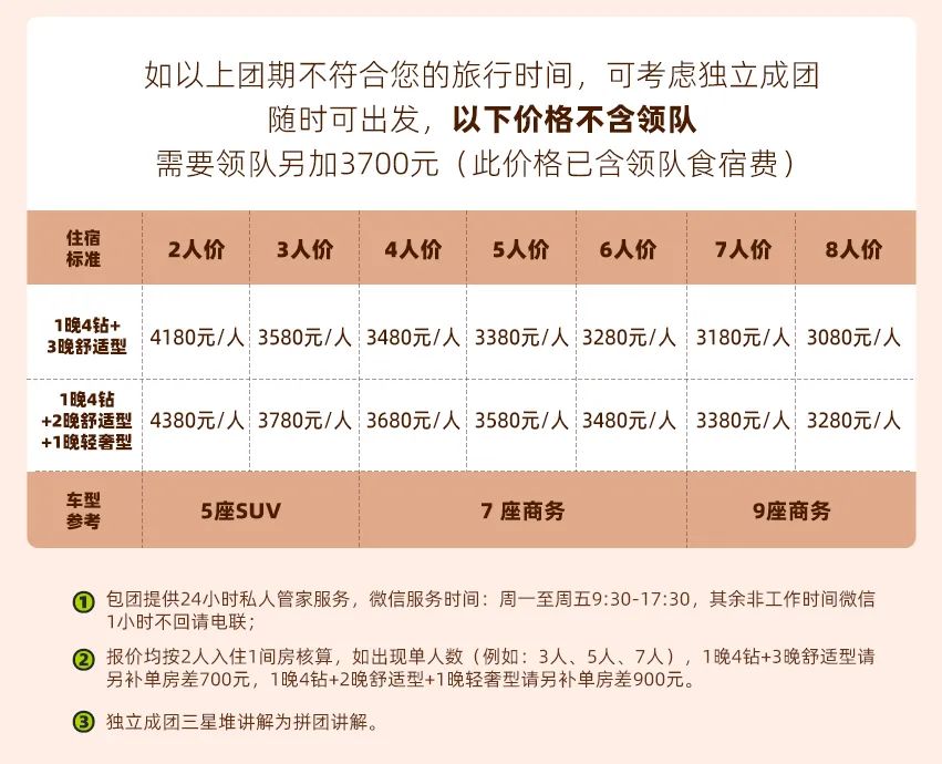 出发前一天:系统将向大家手机或微信上发送集合信息,包括集合地点、领队、车牌等相关提醒,如未收到,请务必联系客服确认。