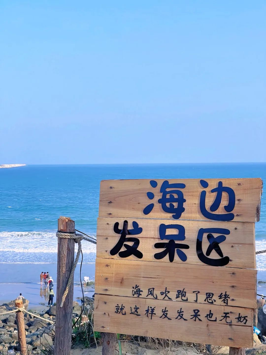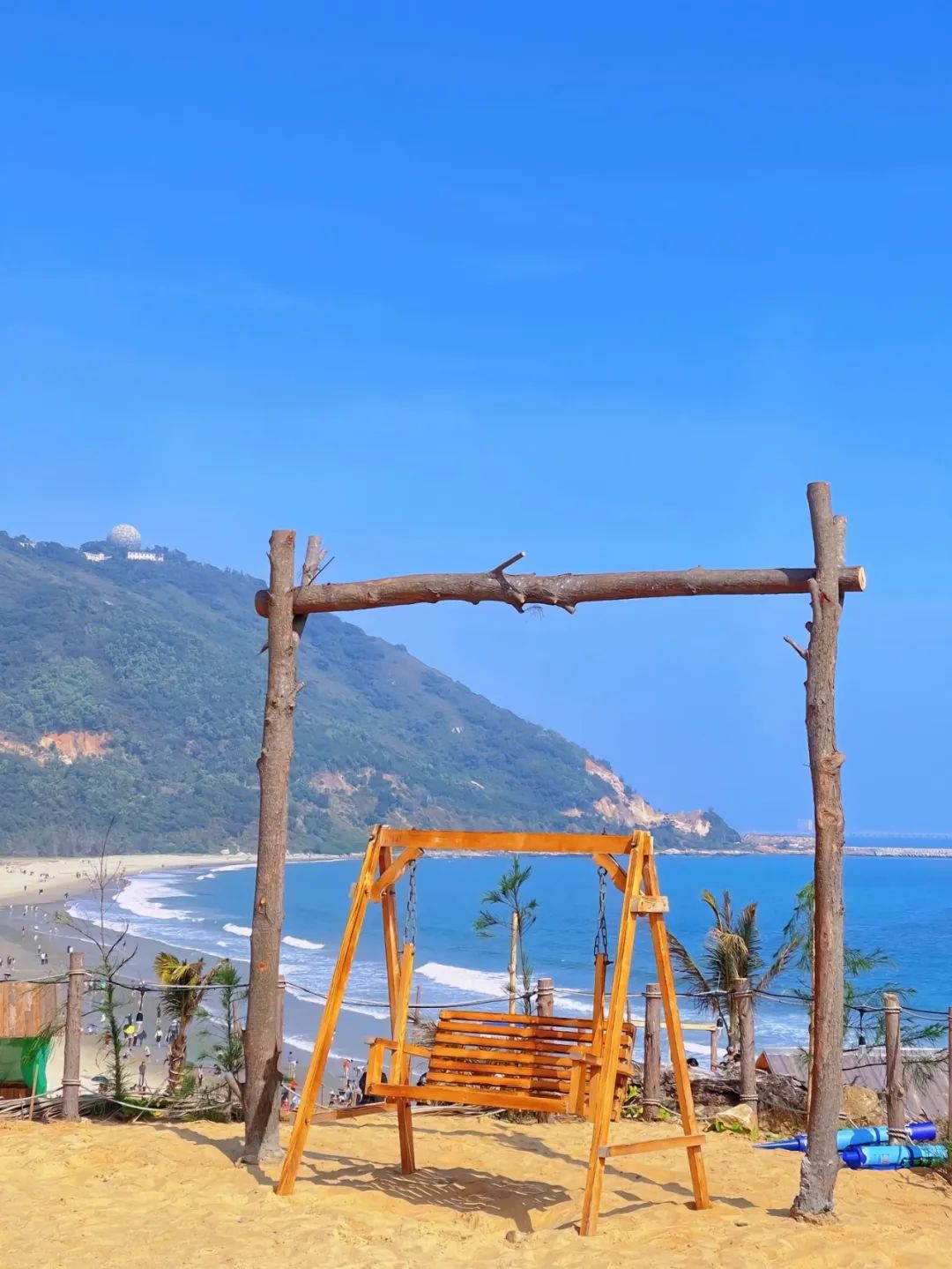 海湾还有许多有趣的小角落,比如小山坡上有块牌子写着“海边发呆区”,再比如面朝大海的秋千……