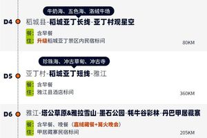 4、景交:稻城亚丁景区观光车120元/人(必须)、稻城亚丁游览车70元/往返(可选)、墨石公园观光车20元/人(必须)、甲居藏寨观光车35元/人(必须)、卓克基官寨门票60元/人(可选);