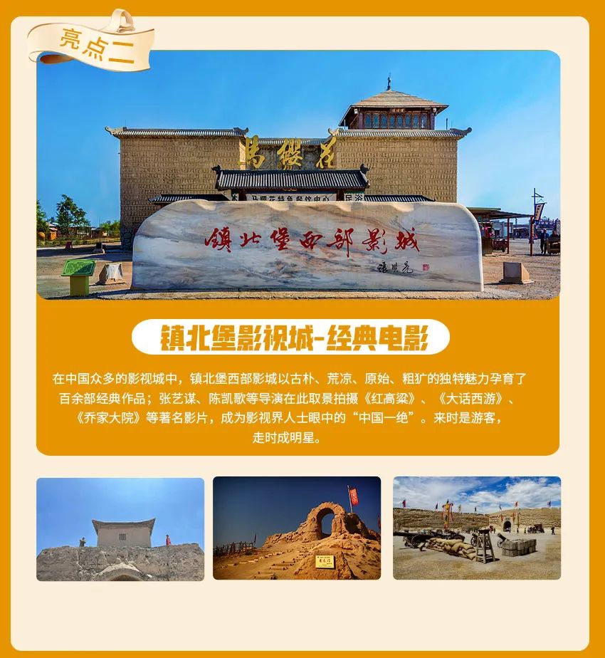 后驱车前往【镇北堡西部影城】(路程约170km,行驶时间2小时,游玩时间2.5h)位于银川市西夏区,在这个以古朴、粗犷、荒凉为特色的影城中,拍摄了《新龙门客栈》、《大话西游》、《牧马人》、《红高粱》《刺陵》、《锦衣卫》等经典影片,一大批中国电影界名人都在这里留下过足迹,如巩俐、姜文、张艺谋、葛优、周星驰、甄子丹等。