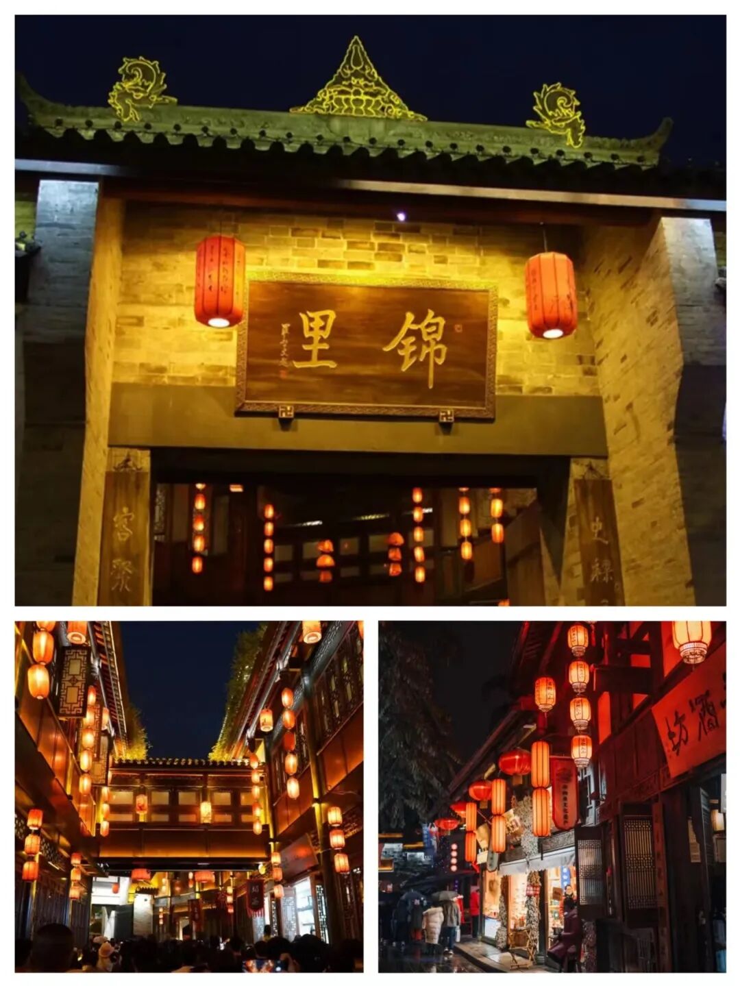 锦里古街的道路不宽,青石板路蜿蜒前伸。主街两旁的仿古建筑一字排开,青灰色的砖瓦屋顶错落有致,过梁的横木粗壮浑圆,各式各样的木质窗棱古朴典雅,店铺的望子随风飘扬。蜿蜒曲折的院落、街巷、水岸、湖泊、荷塘、石桥相呼应,主题会所、餐饮店、商店坐落其中,水波灯影,别有一番意境。