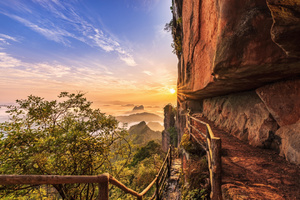 丹霞之险—巴寨景区。巴寨,丹霞山最高峰,享有“丹霞至尊”之美称。巴寨,经历代豪绅、土王修缮,成为粤北战乱时期著名的天然堡垒。巴寨的山形气势极具王者风范,山上风光绝美,犹如人间仙境。