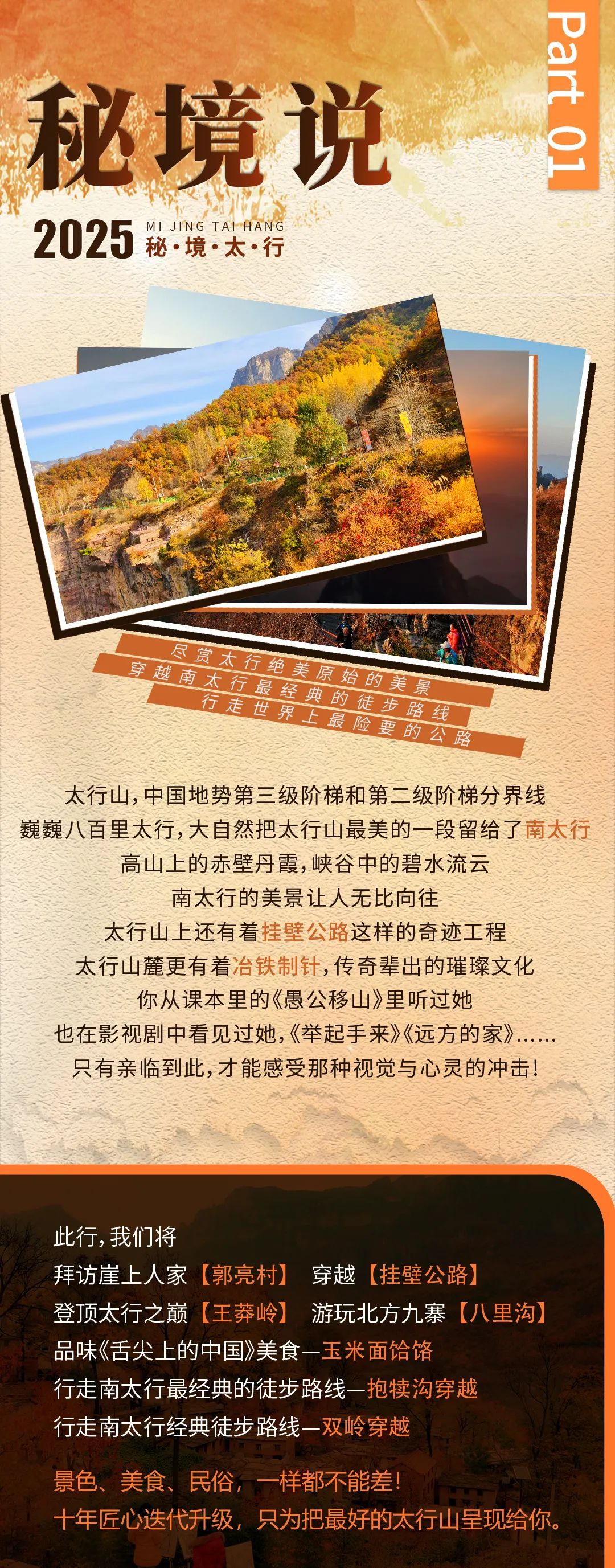 1、不徒步的伙伴,可以休闲游玩天界山,九连山等景区,全方位感受太行的峡谷景观和历史人文,详询客服。