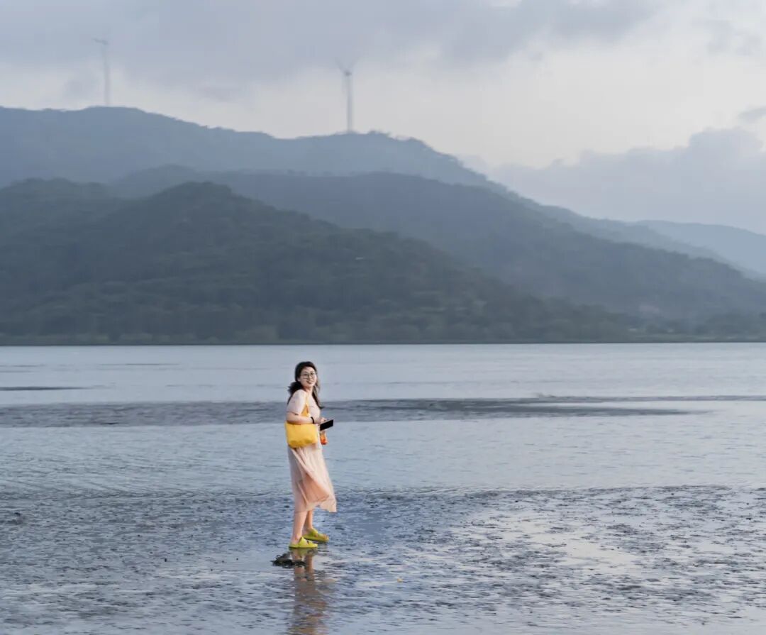 沙滩上薄薄的水竟然能够倒影天空和人影