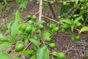 在青山绿水间,五六成熟的李子一串一串挂满了枝头,
