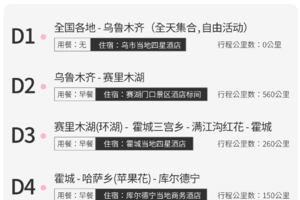 【集合地点】乌鲁木齐市区指定酒店,请报“绝色新疆”+姓名入住,酒店入住时间14:00后,提前抵达可将行李先寄存在酒店前台先出去游玩,贵重物品请随身携带,自由活动期间注意安全;