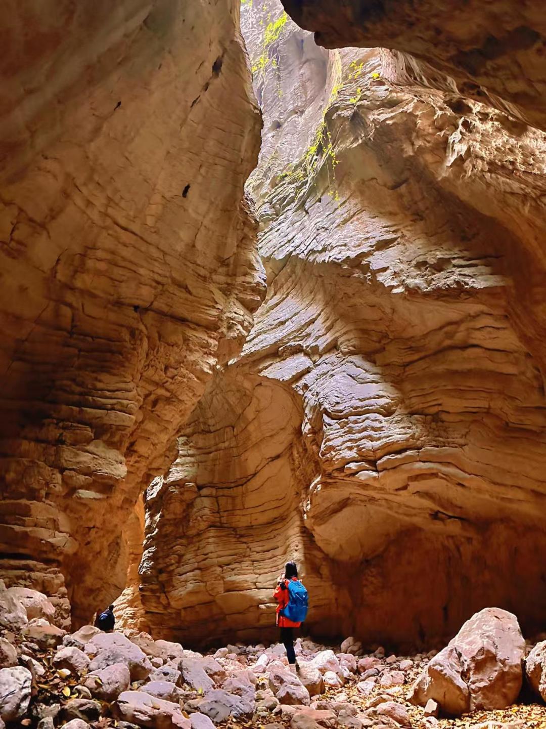 沿着河谷进入这段徒步中具有挑战性的部分夹儿沟,初入时,仿佛来到远古时代,这里的岩石褶皱记录着地球的变迁。这里又像岩石版的美国羚羊谷,丝绸般的光滑,细密的布满了规整而律动的线条纹理。