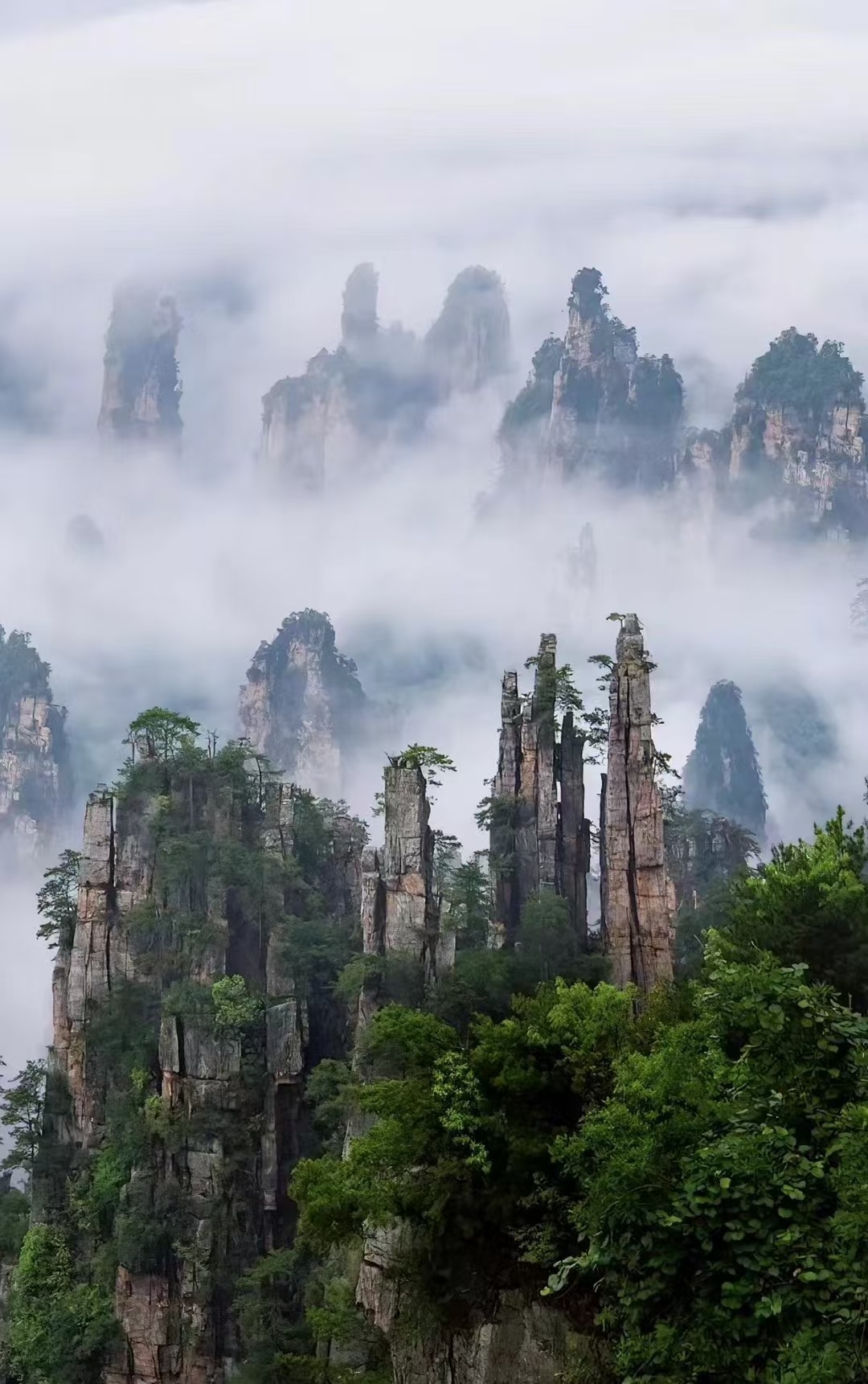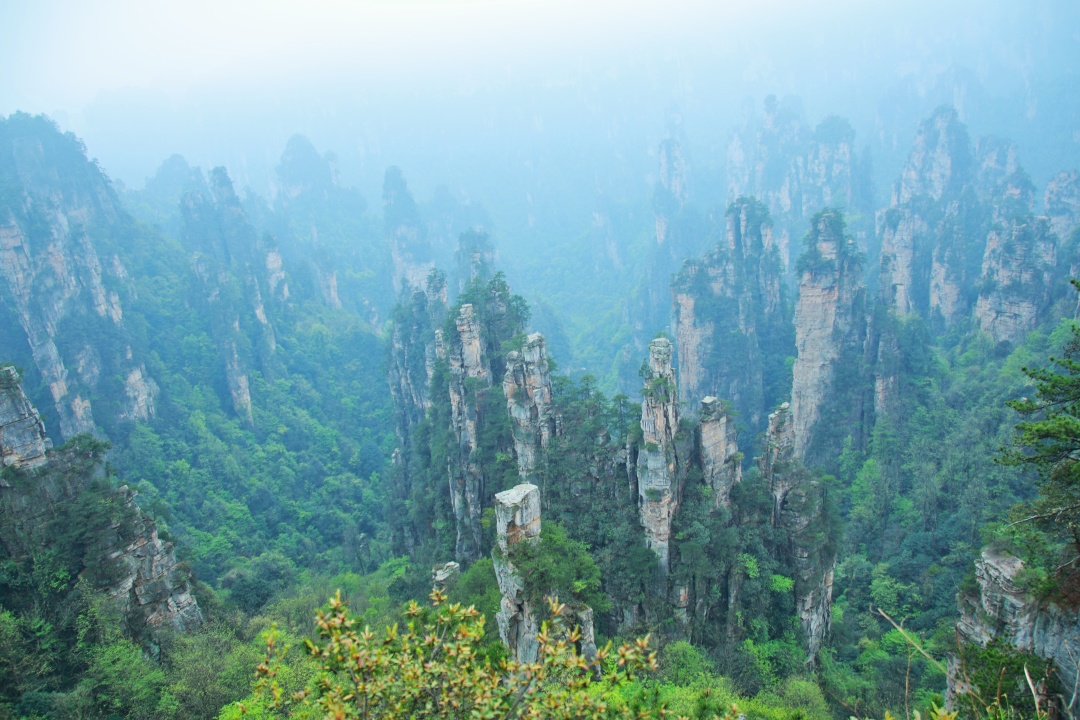 三千多座造型奇异的山峰拔地而起,满目青翠。峰谷间云雾缭绕,随处可见飞瀑溪水,风光美不胜收。每一幅照片单独拿出来,都是大片!