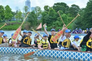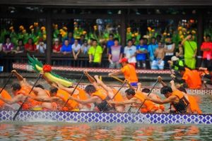 在龙船鼓声激励下,劈波斩浪,同舟共济