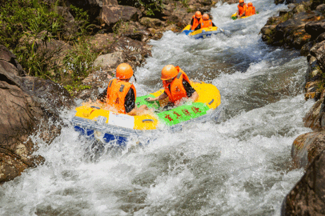 畅玩线:适合家庭亲子游及团队游,提供1小时清凉快乐体验,沿途打卡网红跳台、峡谷水滑道、水上魔毯、峡谷蹦床、水帘洞、网红竹叶舟、香蕉船、西瓜船等项目。
