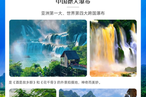 德天跨国大瀑布,是国家国家5A级景区。徒步进入景区游览亚洲第一大、世界第四大跨国瀑布,瀑布由【中国德天瀑布】和【越南板约瀑布】相连构成,横跨中越两国边境,宽208米,落差70米,纵深60米,三级跌落,雄奇壮阔!来德天跨国瀑布沉浸自然奇观中,感受巨大的瀑布从高山峡谷中跌宕而下,水花四溅,仿佛大自然的交响乐。欣赏瀑布壮丽的景象,感受清新的空气,将你的身心融入这片大自然的美丽怀抱。