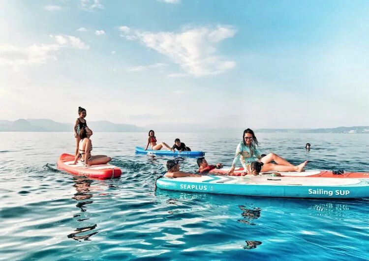 听从领队安排以及项目讲解,分组分批次领取浮潜和桨板工具,全程穿着救生衣,自由约伴下海玩浮潜/桨板(如人多,每个项目需限时体验60分钟,如人少则不限时体验)。