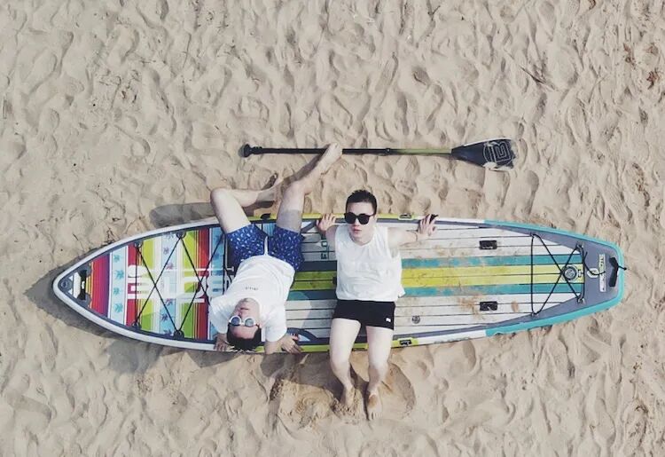 2人一条桨板,自由自在,遵循自己的速度,慢慢的在海上划行~